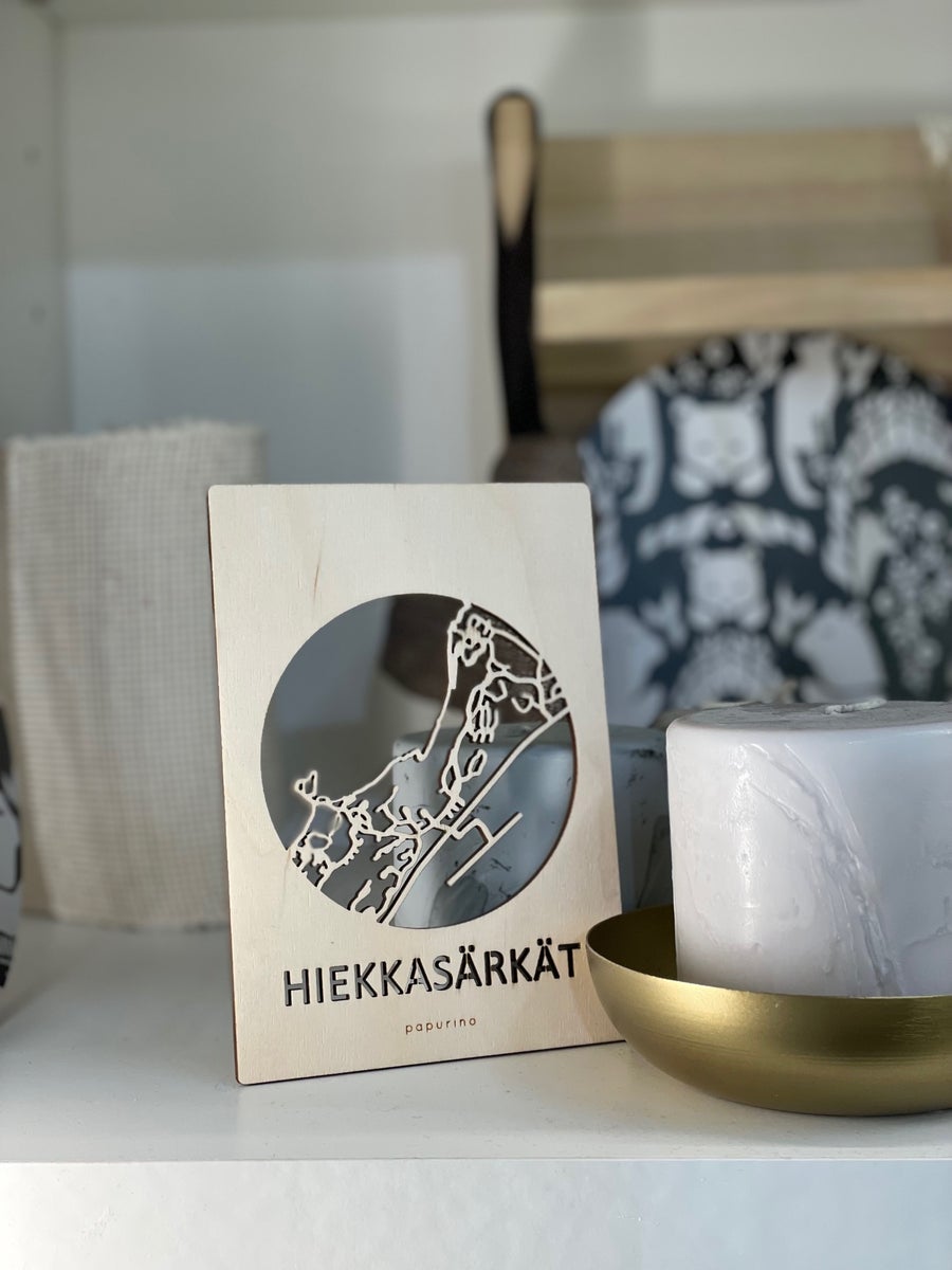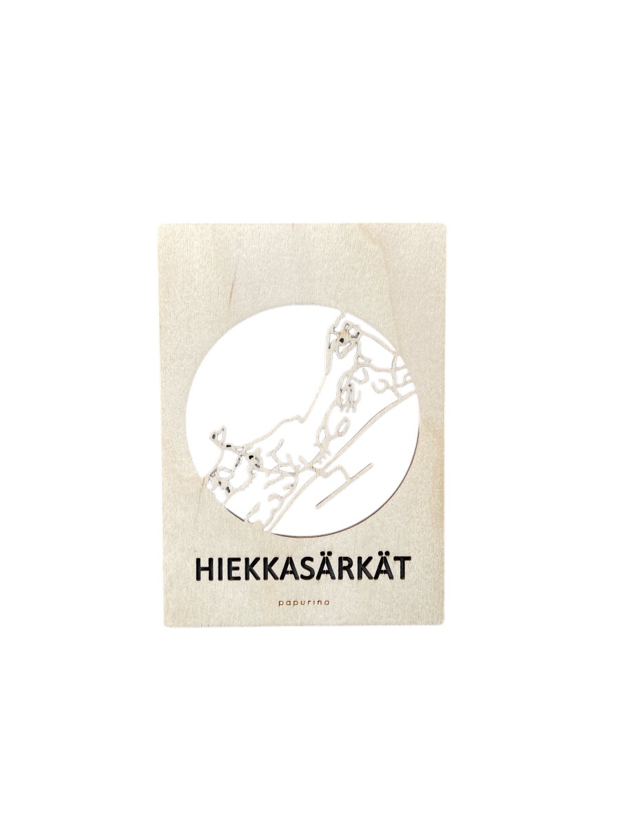 The detailed map of the Kalajoki sand dunes (Hiekkasärkät) is carefully engraved on Finnish birch plywood, making each card a durable and distinctive keepsake.